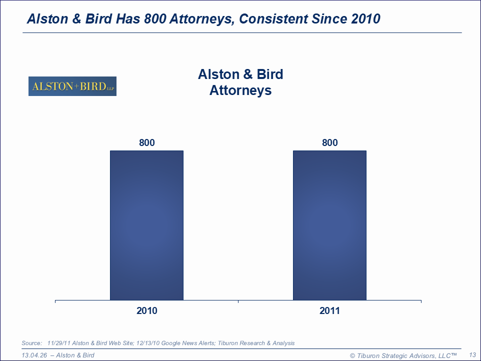 Alston & Bird was founded as Alston, Miller, & Gaines in 1893 and is based in Atlanta, GA. The firm has 9 offices, 1,611 employees, 900 attorneys, generates $650 million revenues, & is led by its Managing Partner Richard Hays. Alston & Bird's web site can be found at www.alston.com.