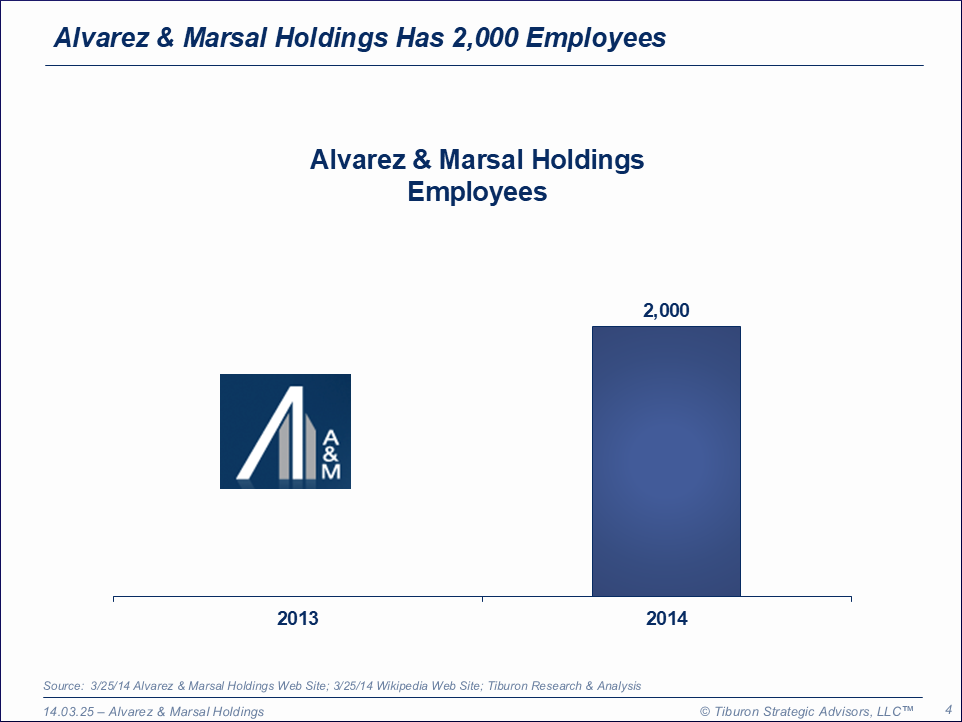 Alvarez & Marsal Holdings was founded by Tony Alvarez & Bryan Marsal in 1983 and is based in New York, NY. It has 43 offices and 2,000 employees. It is led by its Co-CEOs Tony Alvarez & Bryan Marsal. Its web site can be found at www.alvarezandmarsal.com.