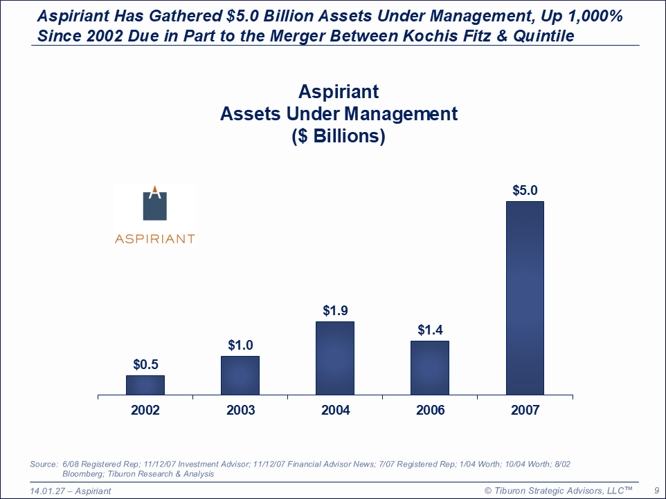 Aspiriant was founded by Tim Kochis & Linda Fitz in 1991 and is based in San Francisco, CA. The firm has 68 employees, 385 clients, 2,493 accounts, $5.0 billion assets under management, and is led by its CEO Rob Francais. Its web site can be found at www.aspiriant.com.