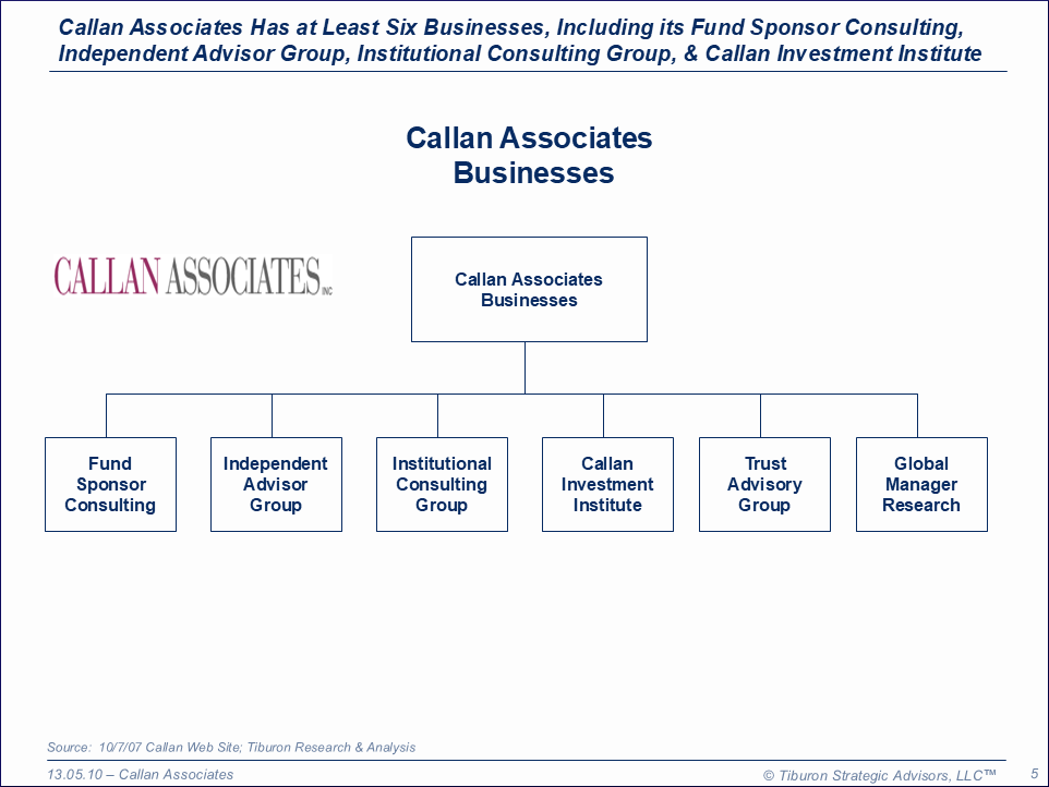 Callan Associates was founded in 1973. The company has five offices, 170 employees, 500 institutional clients, $3.1 trillion assets advised, & led by its Chairman Emeritus Ed Callan, CEO Ron Peyton, & President Greg Allen. Callan Associates' web site can be found at www.callan.com.