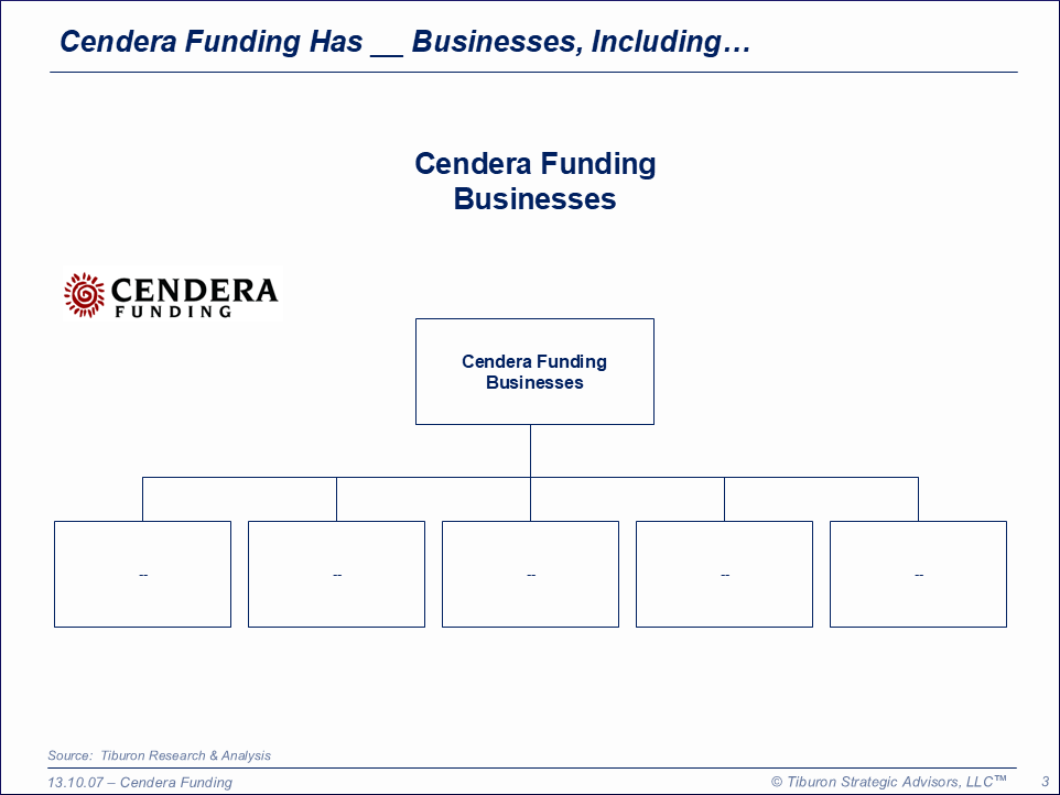 Cendera Funding was founded in XXXX. Cendera Funding is led by its management team. Its web site can be found at XXXX.