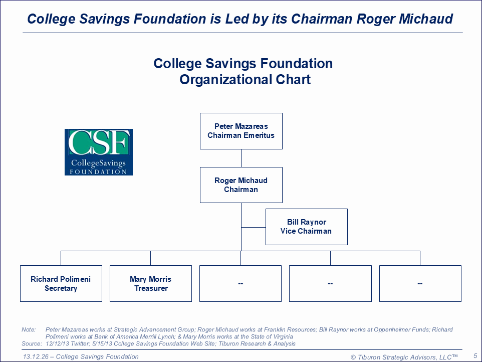 College Savings Foundation is based in Arlington, VA. The organization is led by its Chairman Roger Michaud & Vice Chairman Bill Raynor. Its web site can be found at www.collegesavingsfoundation.org.