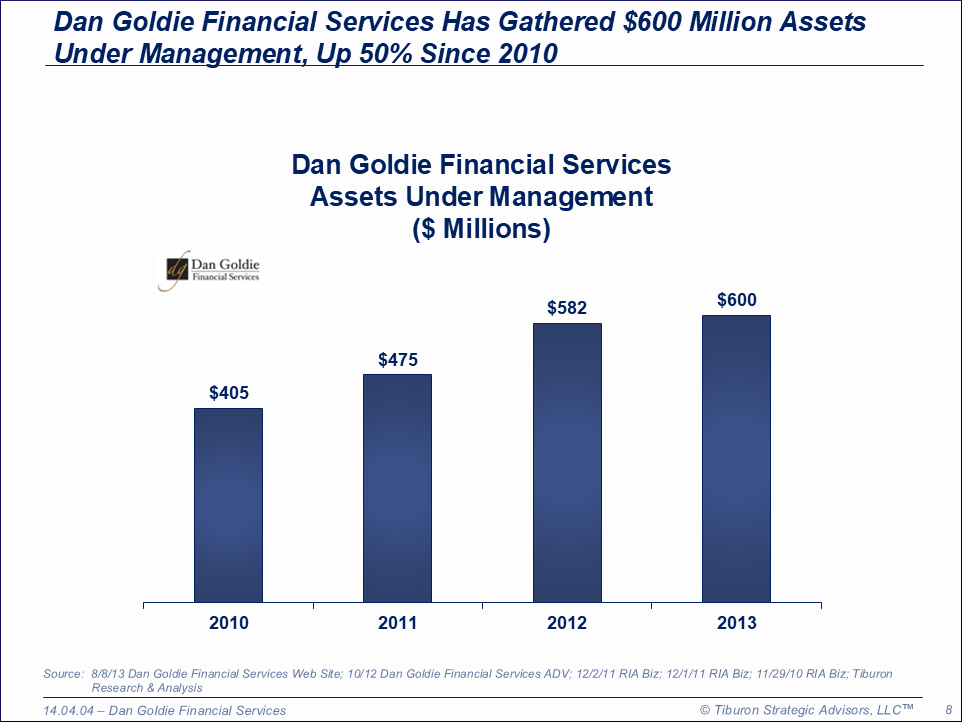 Dan Goldie Financial Services was founded by Dan Goldie and is based in Menlo Park, CA. The firm has one employee, 250 clients, 970 accounts, & $600 million assets under management. Dan Goldie Financial Services is led by its CEO Dan Goldie. Its web sites can be found at www.dangoldie.com & www.theinvestmentanswerbook.com.