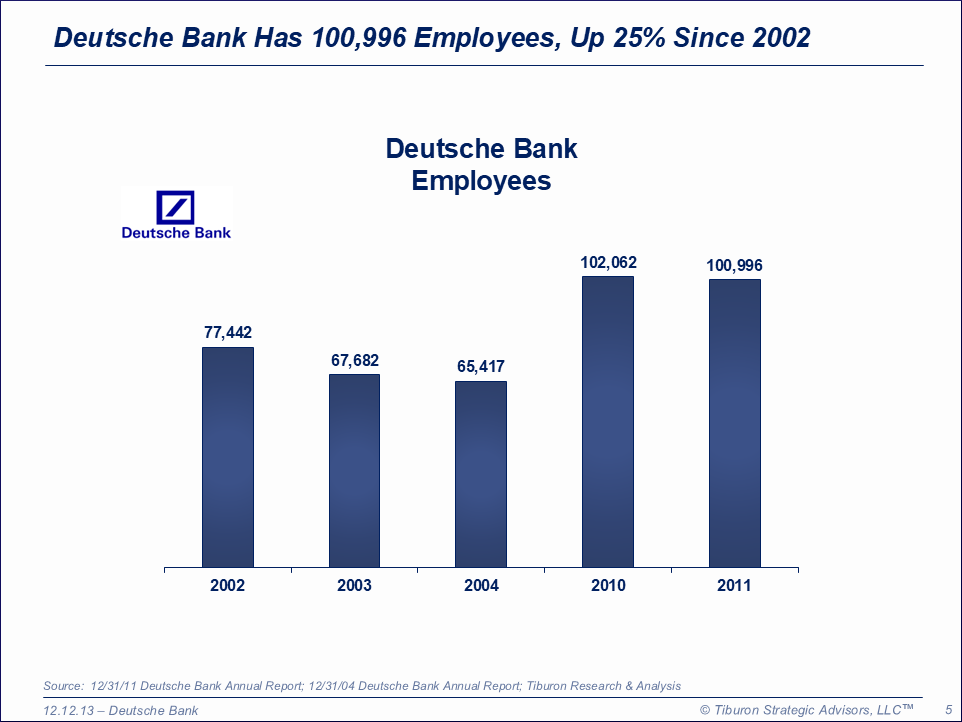 Deutsche Bank was founded and is based in Frankfurt, Germany, has 3,078 branches, 100,996 employees, $1.3 trillion assets, $35 billion revenues, and earns $4.0 billion. Deutsche Bank is led by its Co-CEOs Jurgen Fitschen & Anshu Jain. Deutsche Bank is a public company trading on Deutsche Borse as DBK and on The New York Stock Exchange as DB. Its web sites can be found at www.db.com, www.scudder.com, & www.mortgageit.com