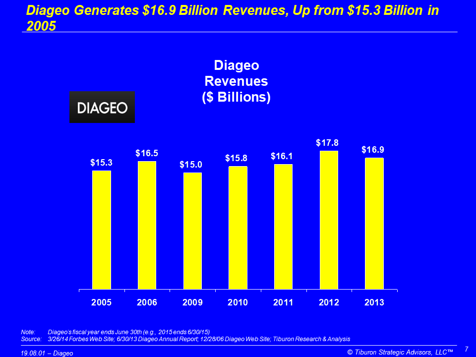 Diageo was founded in 1997 and is based in London, England. The company has operations in 80 countries, 25,698 employees, & generates $16.9 billion revenues. Diageo is led by its CEO Paul Walsh and is a public company trading on the London Stock Exchange as DGE and the New York Stock Exchange as DEO. Its web sites can be found at www.diageo.com, www.diageowineshop.com, www.aboutwines.com, www.bvwine.com, www.blossomhill.com, www.chalonewinegroup.com, www.acaciawinery.com, www.acaciavineyard.com, www.chalonevineyard.com, www.croftport.com, www.kobrandwine.com, www.gaia-wines.gr, www.glenellenwinery.com, www.kourtakis.com, www.ncorreas.com, www.mummnapa.com, www.oenoforos.se, & www.taylor.pt.
