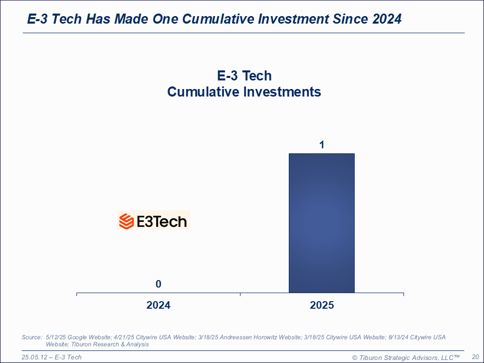 E-3 Tech was founded by Rajini Kodialam in 2024. E-3 Tech is based in Miami, FL. E-3 Tech has one institutional investor, one investment, one cumulative investment, & one portfolio company. E-3 Tech is led by its CEO Rudy Adolf. E-3 Tech is privately owned. Its website can be found at www.e-3tech.com.