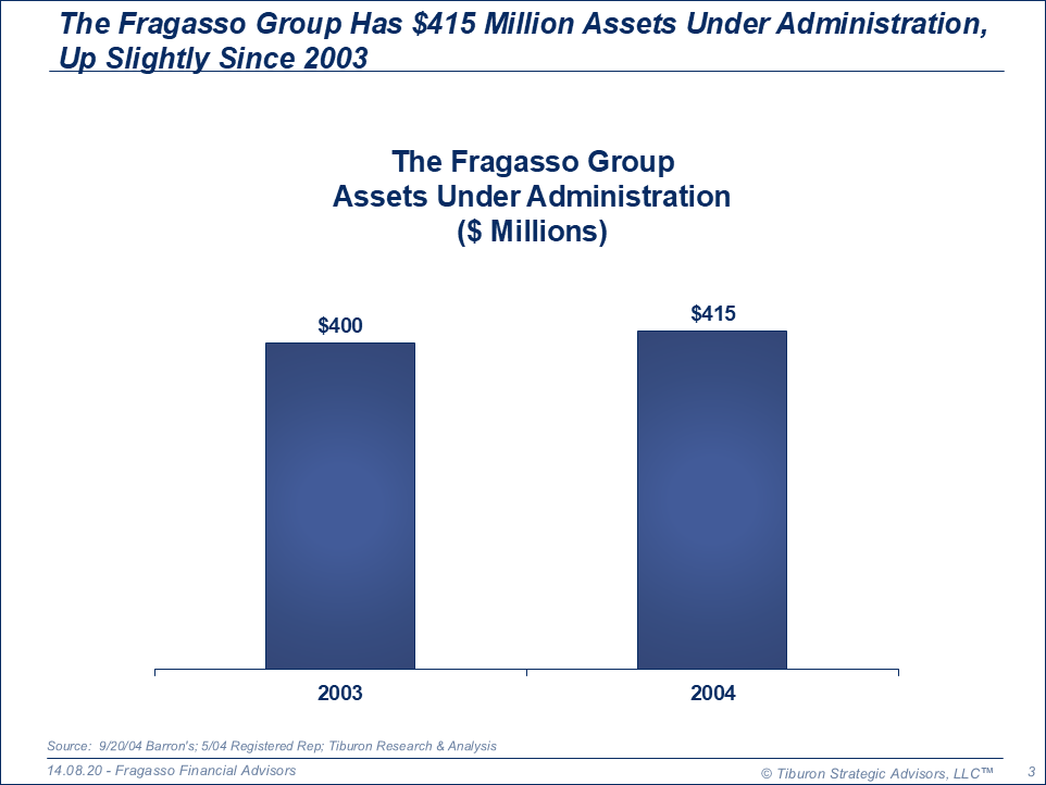 Fragasso Financial Advisors was founded by Bob Fragasso in 1972 and is based in Pittsburgh, PA. It is led by its CEO Bob Fragasso. Its web site can be found at www.fragassoadvisors.com.