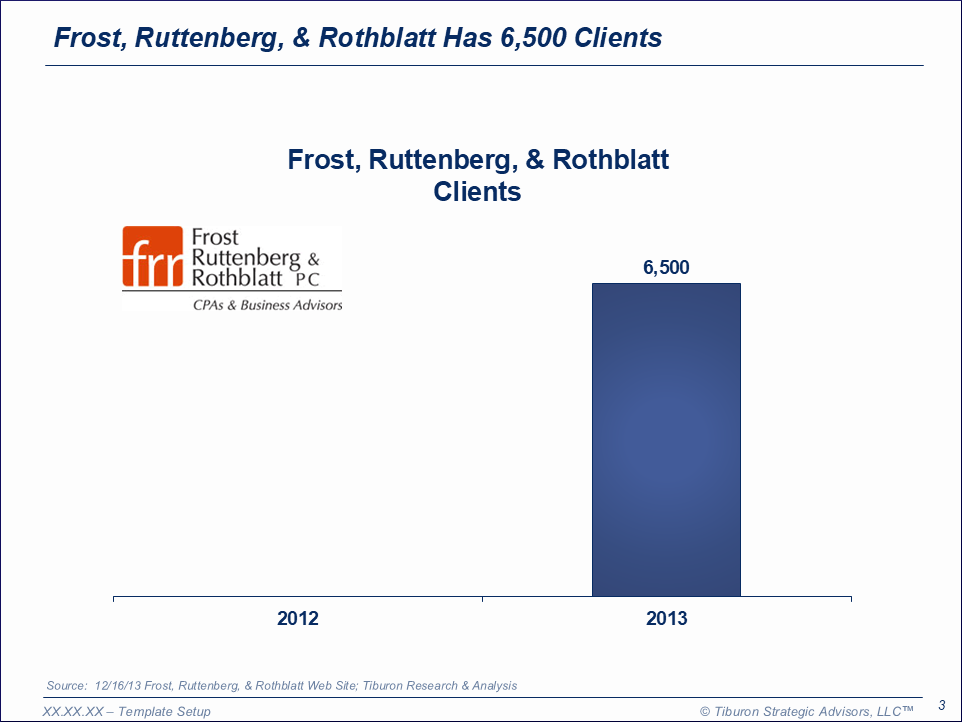 Frost, Ruttenberg, & Rothblatt was founded by Lewis Frost, James Ruttenberg, & Edward Rothblatt in 1955 and is based in Deerfield, IL. It has 6,500 clients. The firm is led by its President Rick Sgarlata. Its web site can be found at www.frrcpas.com.