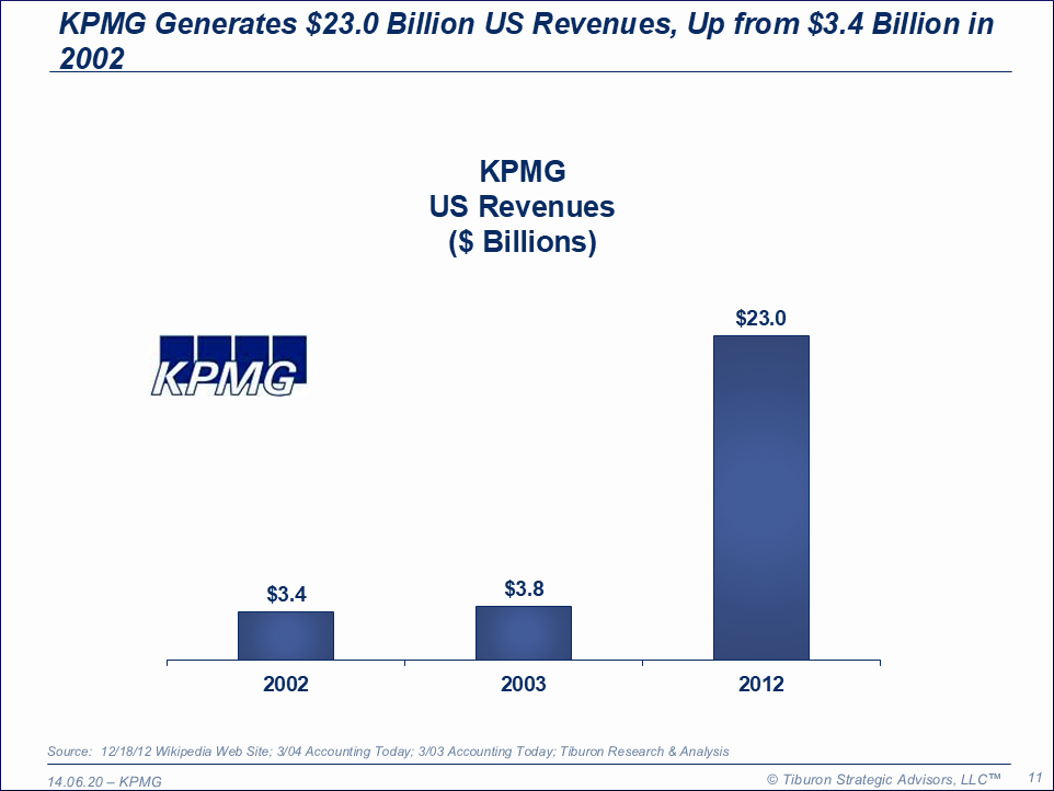 KPMG was founded by Thomson McLintock & Pete Marwick in 1987 and is based in New York, NY. The company has 87 US offices, 145,000 employees, 6,600 partners, & $10.7 billion revenues. KPMG is led by its Chairman Timothy Flynn. KPMG's web site can be found at www.kpmg.com.