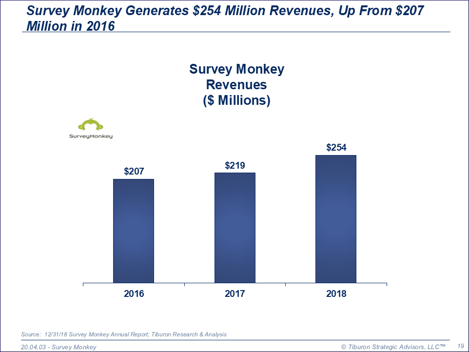 Survey Monkey was founded by Ryan Finley in 1999 and is based in Palo Alto, CA. Survey Monkey has ten offices, 300 employees, $254 million revenues, & $76 million net loss. It is led by its CEO Zander Lurie. Its web site can be found at www.surveymonkey.com.