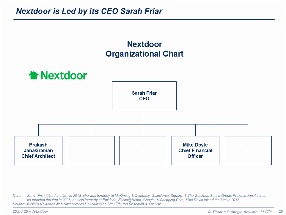 Nextdoor was founded by Prakash Janakiraman, Sarah Leary, Nirav Tolia, & David Wiesen in 2008. Nextdoor is based in San Francisco, CA. Nextdoor has four offices. Nextdoor is led by its CEO Sarah Friar. Its web site can be found at www.nextdoor.com.