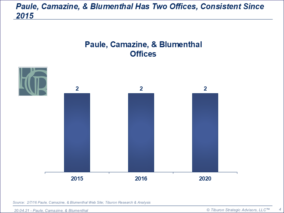 Its profile includes the key statistics of the Paule, Camazine, & Blumenthal, including its number of offices, employees, clients, revenues, & net profits.