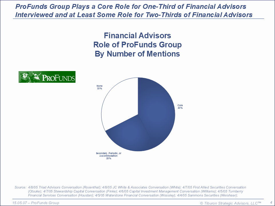 ProFunds Group was founded in 1997 and is based in in Bethesda, MD. The firm has 60 employees, 1,400 financial advisor clients, $30 billion assets under management, and is led by its CEO Michael Sapir. Its web sites can be found at www.profunds.com & www.proshares.com.