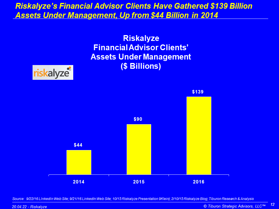 Riskalyze was founded by Aaron Klein, Mike McDaniel, & Matt Pistone in 2011 and is based in Auburn, CA. The company has two offices, 178 employees, 10,000 financial advisor clients, & $139 billion financial advisor clients' assets under management. The firm is led by its CEO Aaron Klein. Its web site can be found at www.riskalyze.com.