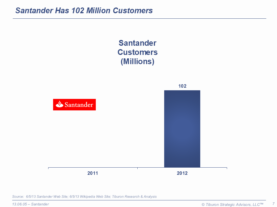 Santander was founded as Banco Santander in 1857 and is based in Madrid, Spain. The company has operations in 31 countries, 14,392 branches, 186,763 employees, & 102 million customers. Santander is led by its Chairman Emilio Botín & CEO Alfredo Sáenz and is a public company trading on The New York Stock Exchnage as SAN. Santander's web sites can be found at www.santander.com, www.santanderconsumerusa.com, www.abbey.com, www.santander.co.uk, www.scotprov.co.uk, www.santander.com.mx, & www.sovereignbank.com.