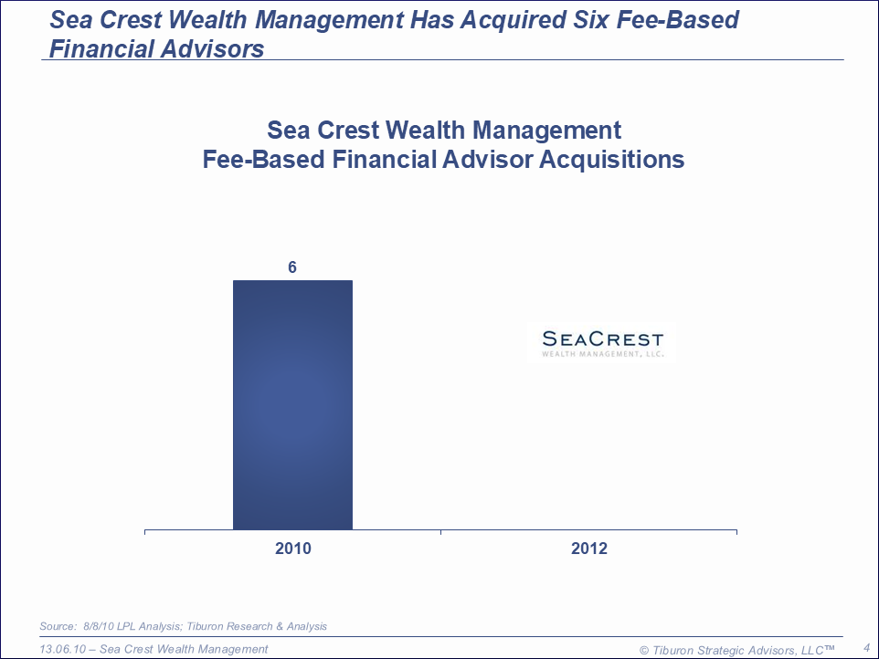 Sea Crest Wealth Management was founded by Edward Sullivan in 2008 and is based in Purchase, NY. The company has made six acquisitions, has 50 employees, sixteen financial advisors, & $400 million assets under management, and earns $5.0 million. Sea Crest Wealth Management is led by its President Edward Sullivan. Its web site can be found at www.seacrestwm.com.