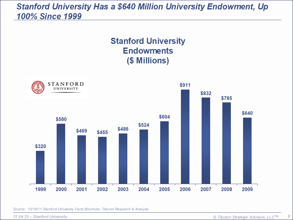Stanford University was founded as The Leland Stanford Junior University in 1891 and is based in in Palo Alto, CA. The university has 15,319 students, 1,475 academic council members, a $640 million endowment, and is led by its President John Hennessy & Provost John Etchemendy. Its web site can be found at www.stanford.edu.