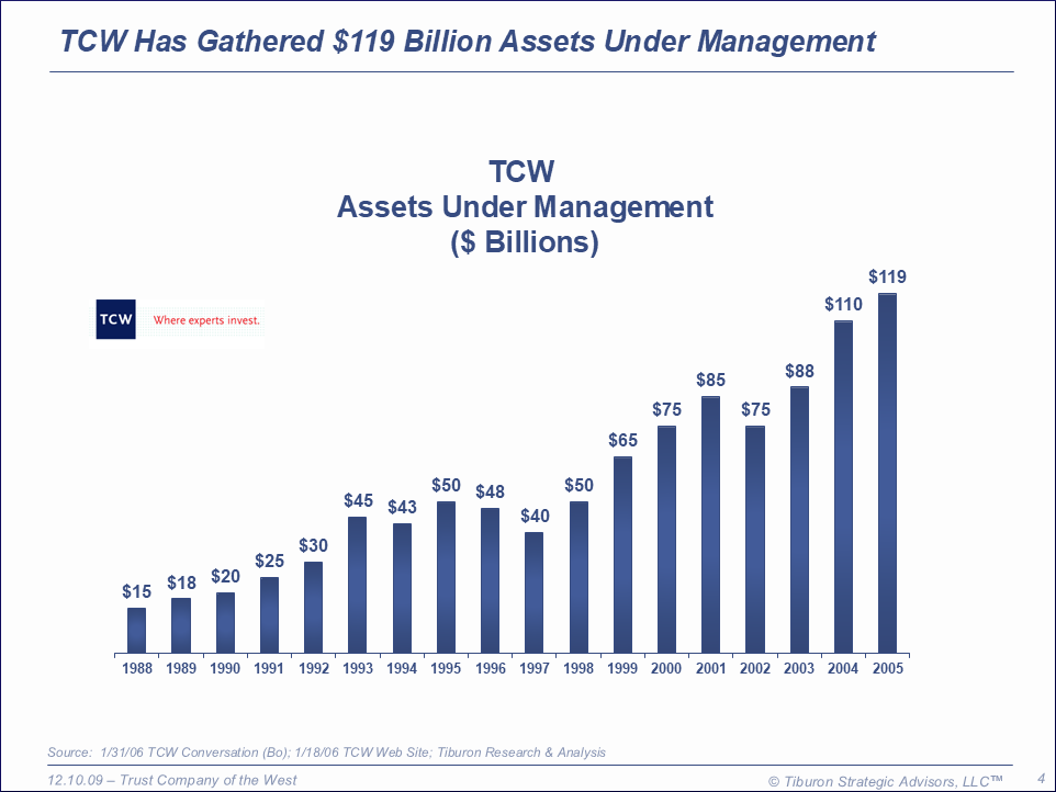 Trust Company of the West was founded in 1971 and is based in Los Angeles, CA. Trust Company of the West is led by its CEO Bob Beyer. Trust Company of the West's web site can be found at www.tcw.com.