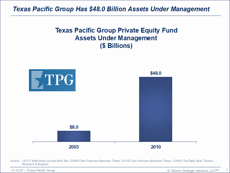 Texas Pacific Group was founded in 1993 and is based in Worth, TX. The company has operations in has ten countries, has seventeen offices, 40 investment professionals, and $48.0 billion assets under management. Texas Pacific Group is led by its Founding Partners James Coutler, William Price, & David Bonderman. Its web sites can be found at www.texpac.com & www.tpg.com.