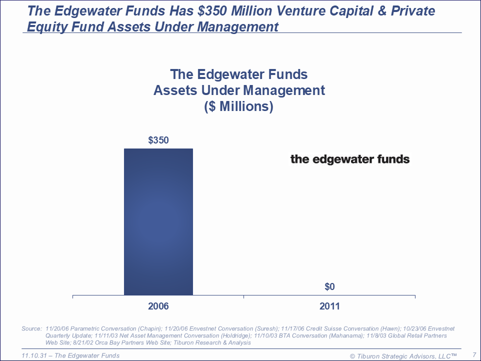 The Edgewater Funds was founded in 1986. It is based in Chicago, IL, has $350 million assets under management and led by its Managing Partner Jim Gordon. The Edgewater Funds' web site can be found at www.edgewaterfunds.com.