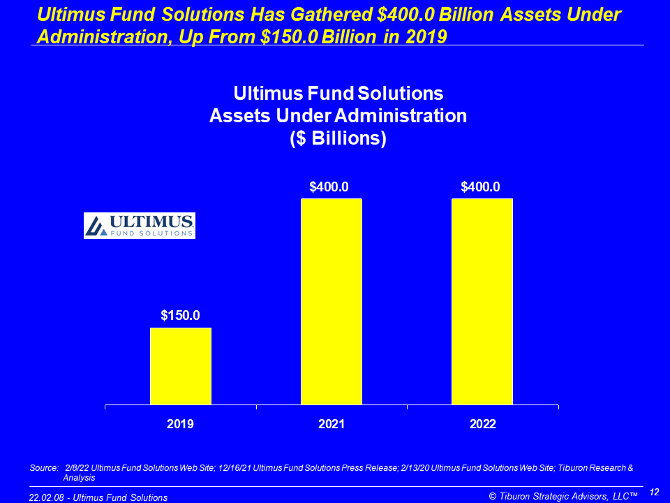 Ultimus Fund Solutions was founded by Bob Dorsey & Mark Seger in 1999. The company is based in Cincinnati, OH. Ultimus Fund Solutions has seven offices, 825 employees, 450 clients, 1,600 funds serviced, & $400.0 billion assets under administration. Ultimus Fund Solutions is led by its CEO Gary Tenkman. Its web site can be found at www.UltimusFundSolutions.com