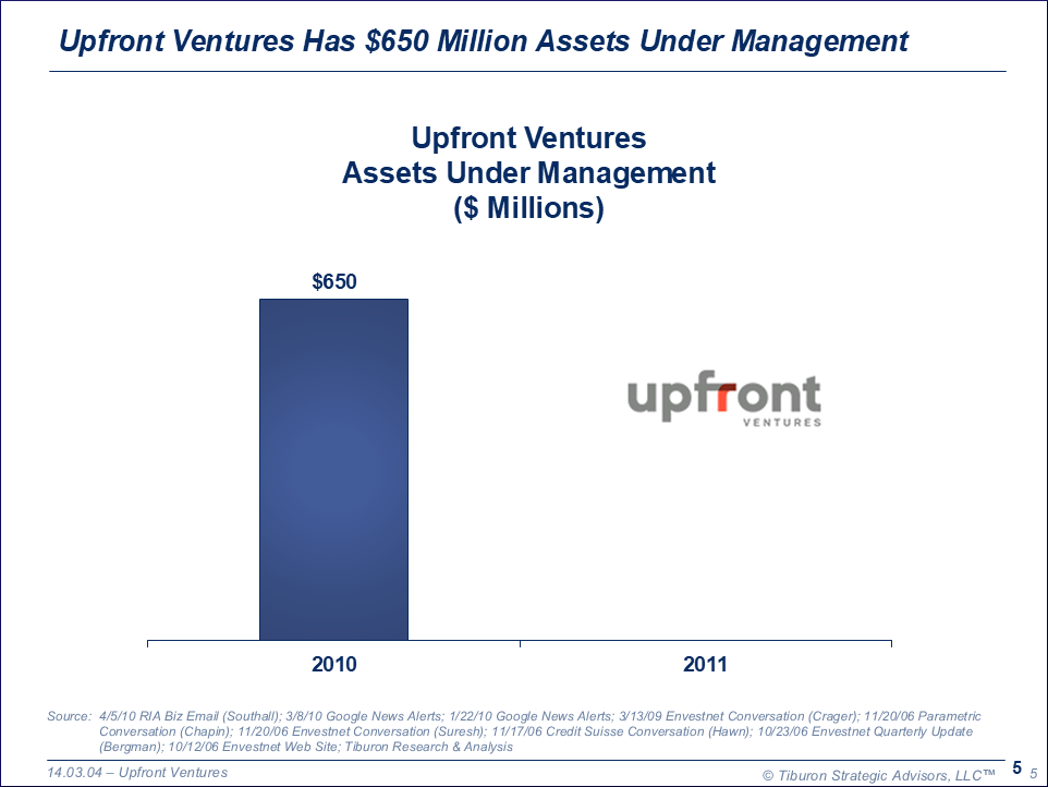 Upfront Ventures was founded in 1996 and is based in Los Angeles, CA. The firm has two offices, $650 million assets under management, has made twenty-seven investments, and led by its Partners Steven Dietz, Brian McLoughlin, Yves Sisteron, & Mark Suster. Its web site can be found at www.upfront.com.
