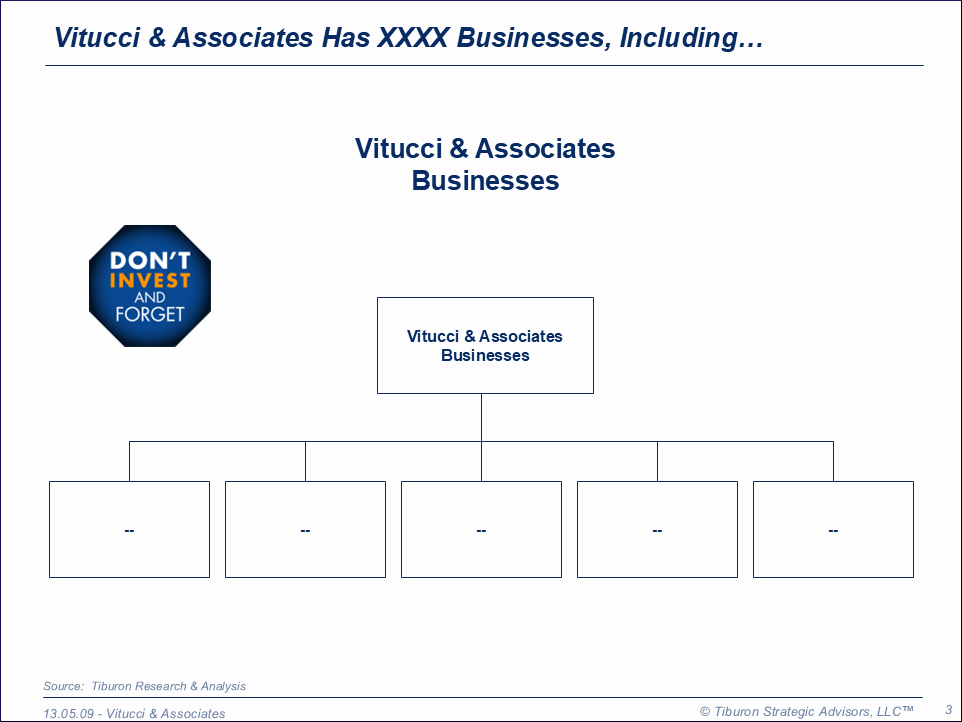Vitucci & Associates was founded in XXXX, and is based in Walnut Creek, CA. The company has XX employees, $XX billion assets under management, $XX million revenues, and earns $XX million. Vitucci & Associates is led by XX, and is privately owned. Vitucci & Associates' website can be found at www.dontinvestandforget.com.