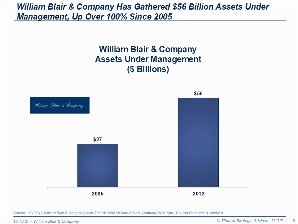 William Blair & Company was founded as Blair, Bonner & Company by William Blair in 1935 and is based in Chicago, IL. The firm has operations in five countries, eleven offices, 1,100 employees, 25 mutual funds, & $56 billion assets under management. William Blair & Company is led by its CEO John Ettelson. William Blair & Company's website can be found at www.williamblairfunds.com.