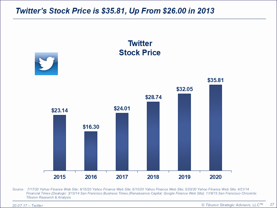 Twitter was founded by Jack Dorsey, Noah Glass, Biz Stone, & Evan Williams in 2006 and is based in San Francisco, CA. Twitter has 35 offices, 4,900 employees, 500 million users, $3.5 billion revenues, $453 million operating income, & $1.5 billion net profits. Twitter is led by its Executive Chairman Omid Kordestani & CEO Jack Dorsey. Twitter is a public company and trades on the New York Stock Exchange under symbol TWTR. Its web site can be found at www.Twitter.com.