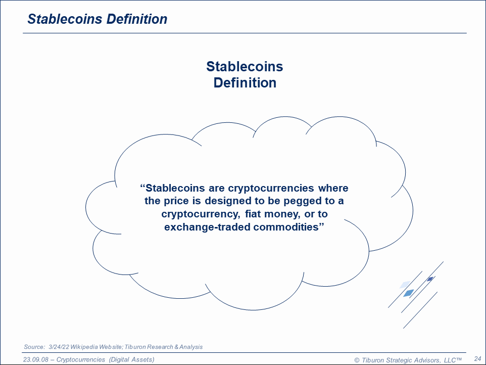 The purpose of this research is to provide readers with a comprehensive understanding of stablecoins, which are are cryptocurrencies where the price is designed to be pegged to a cryptocurrency, fiat money, or to exchange-traded commodities. This research addresses their history and market growth, as well as the leading stablecoins, market participants, and predictions for their future use. This research is part of Tiburon's broader coverage of cryptocurrencies (digital assets) and its even broader coverage of individual securities & capital markets.