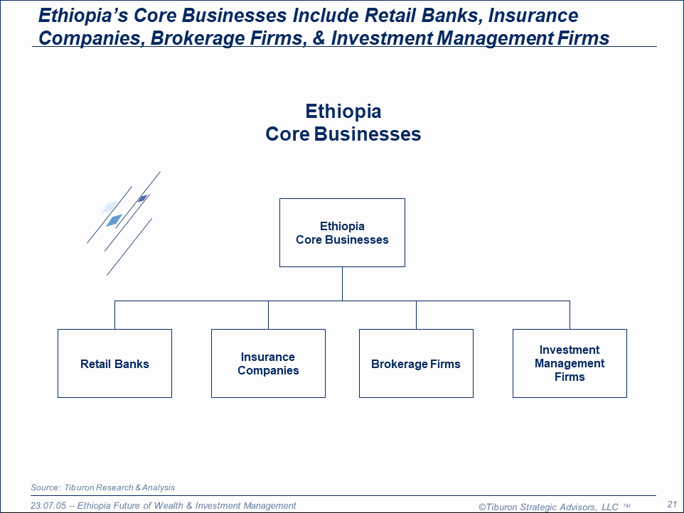 The purpose of this research is to provide readers with a comprehensive understanding of the future of the retail banking, insurance, brokerage, & investment management industries in Ethiopia, which presents substantial wealth but also challenges for United States financial services firms, including a different language, different currency, & different laws. In short, this research defines the future of financial services in Ethiopia and compares these findings to those of the United States in order to provide readers with some perspective. Ethiopia has trends parallel to those in the United States, but also some fundamental market differences. This research is part of Tiburon's broader coverage of the future of wealth & investment management in European, Middle Eastern, & African markets.