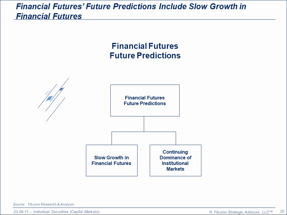The purpose of this research is to provide readers with a comprehensive understanding of financial futures, which are financial contracts obligating buyers to purchase assets or sellers to sell assets with predetermined future dates & prices. Financial Futures contracts allow investors to speculate on the future direction of securities. This research addresses the history, market growth, leaders, markets & distribution channels, and predictions for their future use. This research is part of Tiburon's broader coverage of individual securities (capital markets).
