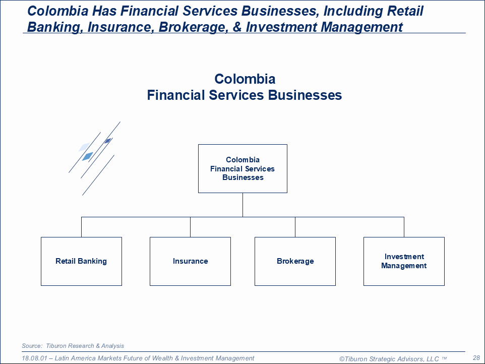 The purpose of this research is to provide readers with an initial understanding of the future of the retail banking, insurance, brokerage, & investment management industries in Colombia, which provides geographical proximity but also challenges for United States financial services firms, including a different language, different currency, & different laws. In short, this research defines the future of financial services in Colombia and compares these findings to those of the United States in order to provide readers with some perspective. Colombia has trends parallel to those in the United States, but also many fundamental market differences. This research is part of Tiburon's coverage of the Latin America Markets.