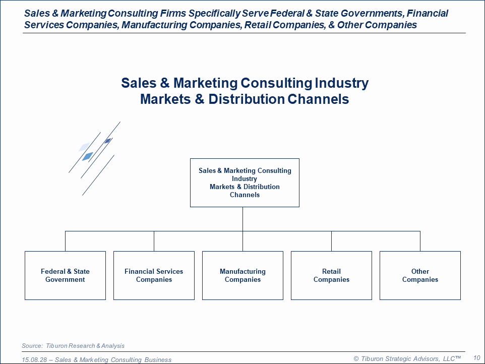 The purpose of this research is to provide readers with an initial understanding of the sales & marketing consulting industry. The research highlights sales & marketing consulting firm clients, including federal & state governments, financial services companies, manufacturing companies, retail companies, & other companies. And the research provides future predictions for the sales & marketing consulting market in two areas, including its renewed rapid growth & continual industry consolidation, and the increasing importance of financial services company clients.