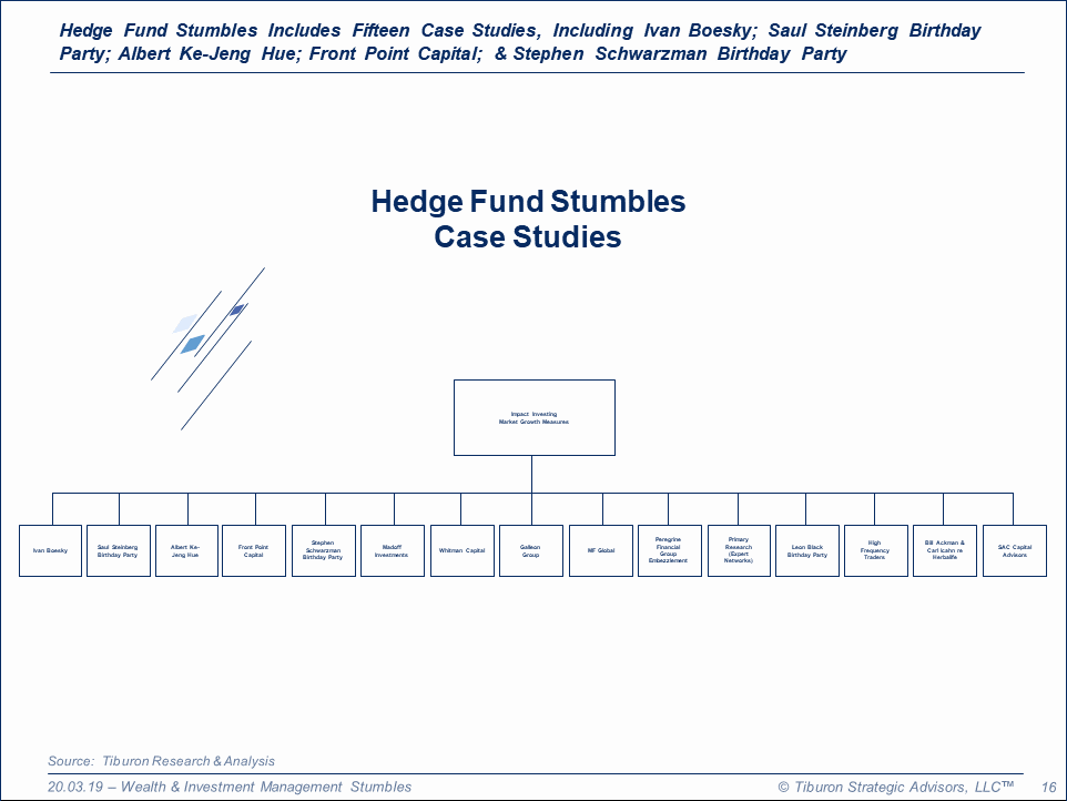 The purpose of this research is to provide readers with a comprehensive understanding of hedge fund stumbles and their impact on the financial services industry, various products & services, various markets & distribution channels, and specific financial services firms. This research addresses prominent hedge fund stumbles such as the Madoff Investments scandal, the Galleon Group scandal, the MF Global Holdings scandal, the Peregrine Financial Group scandal, & the SAC Capital Advisor scandal.