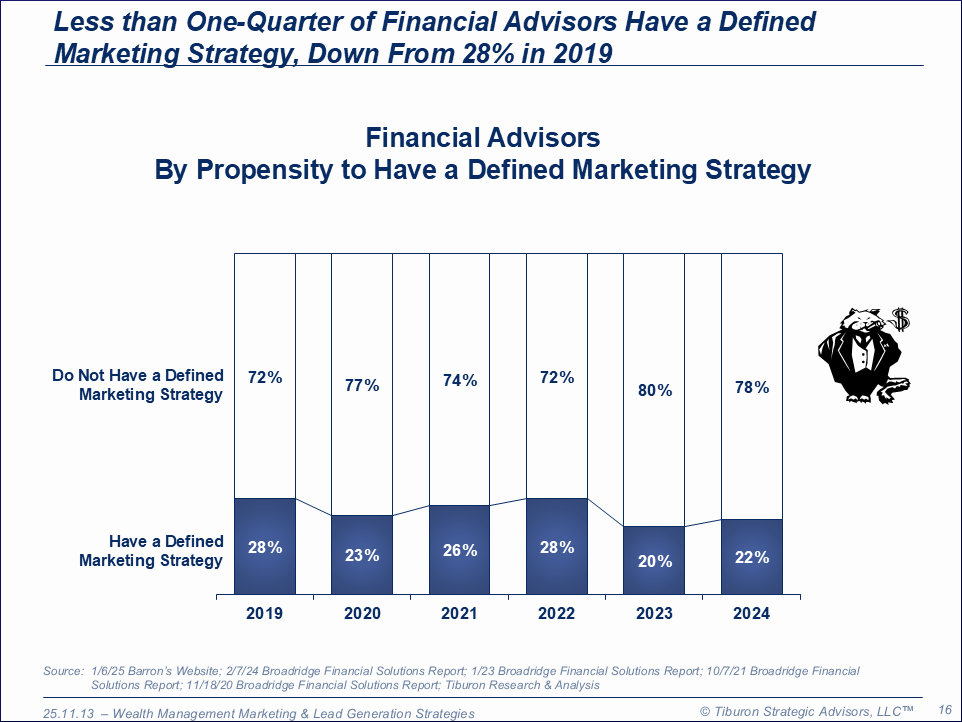 The purpose of this research is to provide readers with a comprehensive understanding of the wide range of potential wealth management marketing & lead generation strategies, including institutional retail strategies (advertising, social media, public & media relations, and sponsorships), financial advisor analog strategies (cold calling, direct mail, networking, professional referrals, custodian referrals, advertising, public & media relations (quotes), newsletters, article writing, books, seminars, analog radio shows, & television shows), financial advisor client-based strategies (client retention, client consolidation, & client referrals), financial advisor digital strategies (websites, social media presence, search engine optimization (SEO), social media proactive marketing (cold contacting), email newsletters (drip marketing), social media posting, branded search advertising, unbranded search advertising, digital advertising, influencer marketing, paid lead gen sources, audiobooks, online webinars, and digital & satellite radio shows), and institutional workplace strategies (retirement plan referrals, stock plan administration referrals, executive benefits referrals, & financial wellness programs referrals). This research is part of Tiburon's broader coverage of wealth management strategies.